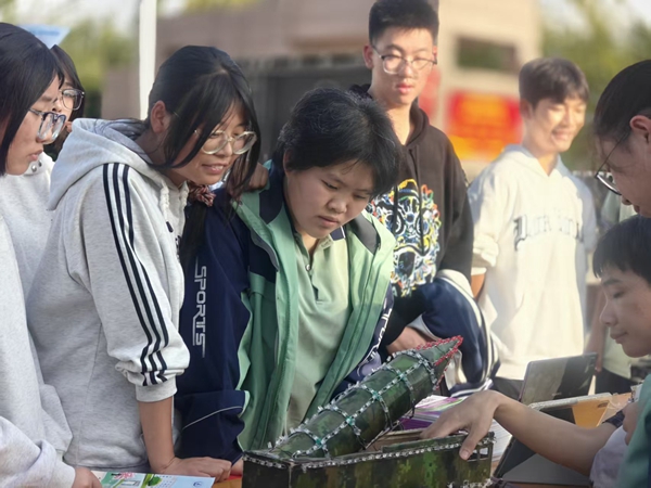 在博闻楼前广场的展示体验区内,学生成果、校内科组社团、校外资源三方联动,热闹非凡。学生成果展位上,学生自主设计的科技作品集中亮相,智能垃圾分类盒、简易节水装置等小发明彰显实用创意,太阳能小车模型、手工机器人等小制作展现动手能力,还有一幅幅精美的科技绘画作品传递科学畅想。不少学生化身“小解说员”,热情向师生介绍作品的设计思路与蕴含的科学原理。