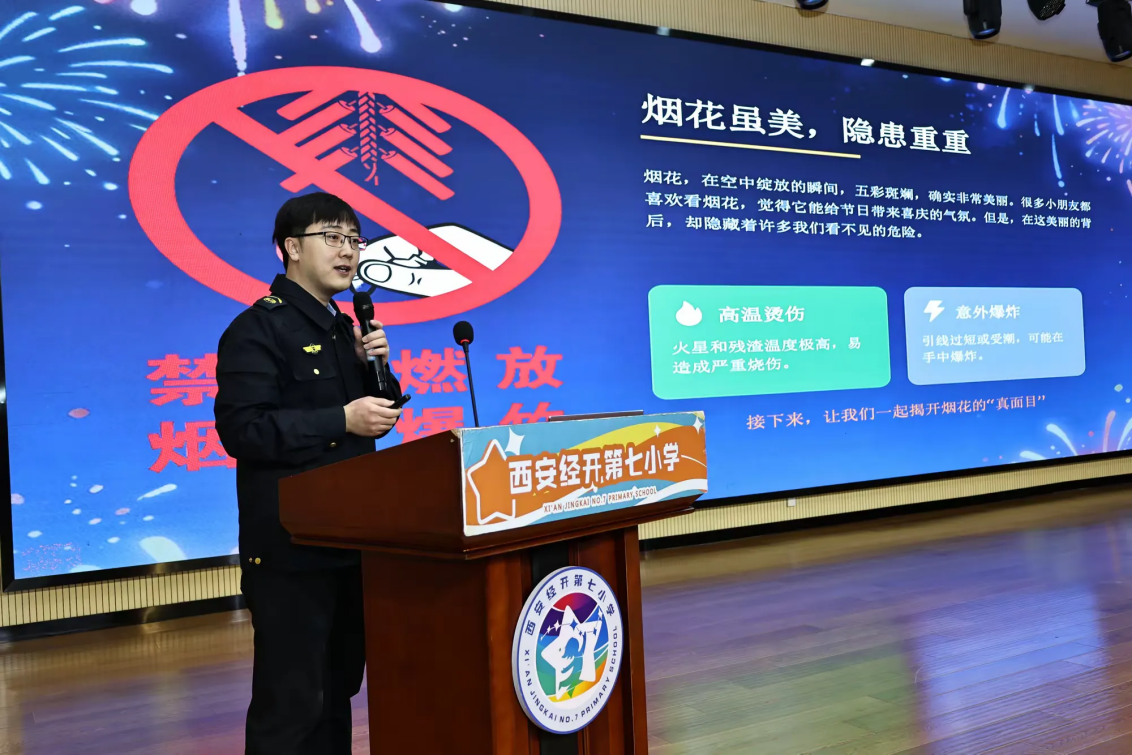 市公安局经开分局民警聚焦法律法规与安全底线,详细解读了经开区全域全时段禁售禁放政策,并结合典型案例,深入剖析了非法储存、燃放烟花爆竹的安全风险。“安全重于泰山,防范始于未然”,民警告诫师生要绷紧安全弦,不仅自己做到不购买、不燃放,还要提醒和监督家人、邻居遵守法规,发现违法线索及时举报,共同维护社区平安。