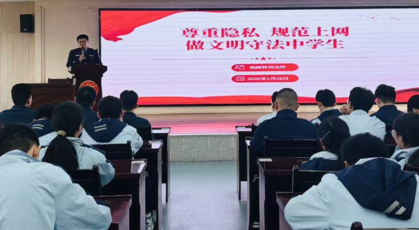 寒假前夕,为进一步加强青少年法治教育,提升在校学生的网络安全意识与隐私保护能力,营造清朗和谐的校园环境,1月26日,柏树林司法所干警走进西安市第八中学,开展“尊重隐私规范上网做文明守法中学生”普法教育课,通过主题鲜明、内容详实地讲解,引导学生树立正确的法治观念,做文明守法的网络参与者。