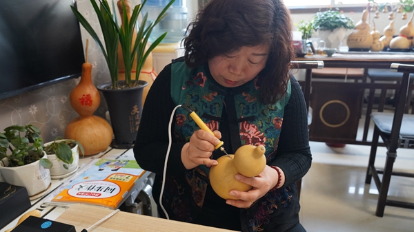 “丈夫也喜欢这手艺,我俩常一起琢磨。”王小英笑着说,夫妻二人的共同爱好,成了她坚持下去的动力。她跟着抖音视频学基础,守着葫芦烙画直播间里非遗传承人的讲解反复揣摩,每天晚上雷打不动伏案三四个小时,在葫芦表皮上练习控温、晕染。从拿不稳烙铁到能根据葫芦的纹理调整力度,从生硬勾勒到线条流畅,指尖的功夫在日复一日的坚持中愈发娴熟。
