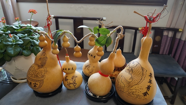 起初,她只是在葫芦上烙些“静心”“舍得”“知足常乐”之类的字样,或是简单的荷花、喇叭花,朴素的线条中藏着对生活的感悟。可刚入门时,难题接踵而至,烙铁温度把控不好,一不小心就把葫芦戳透,线条也总是生硬,她却没半点气馁。