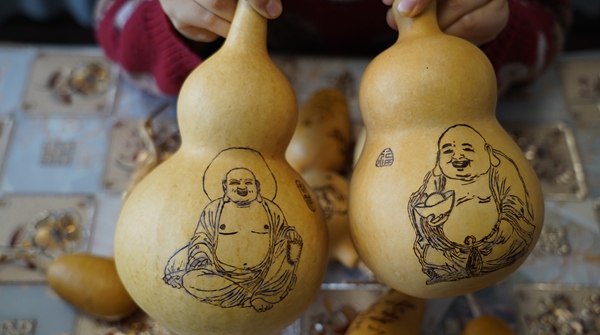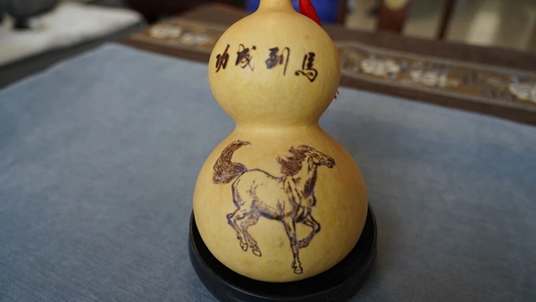 随着马年春节临近,王小英把创作重心转向了新年主题。她先用转印纸勾勒出骏马、财神、年年有鱼的轮廓,再以烙笔为媒,高温处线条遒劲,低温处晕染柔和,让奔腾的骏马神态灵动、喜庆的财神笑意盈盈、鲜活的鱼儿跃然葫芦之上。圆润的葫芦寓意“福禄”,灵动的骏马象征“顺遂”,这些带着吉祥寓意的作品,常有朋友上门讨要,盼着沾份新年喜气。